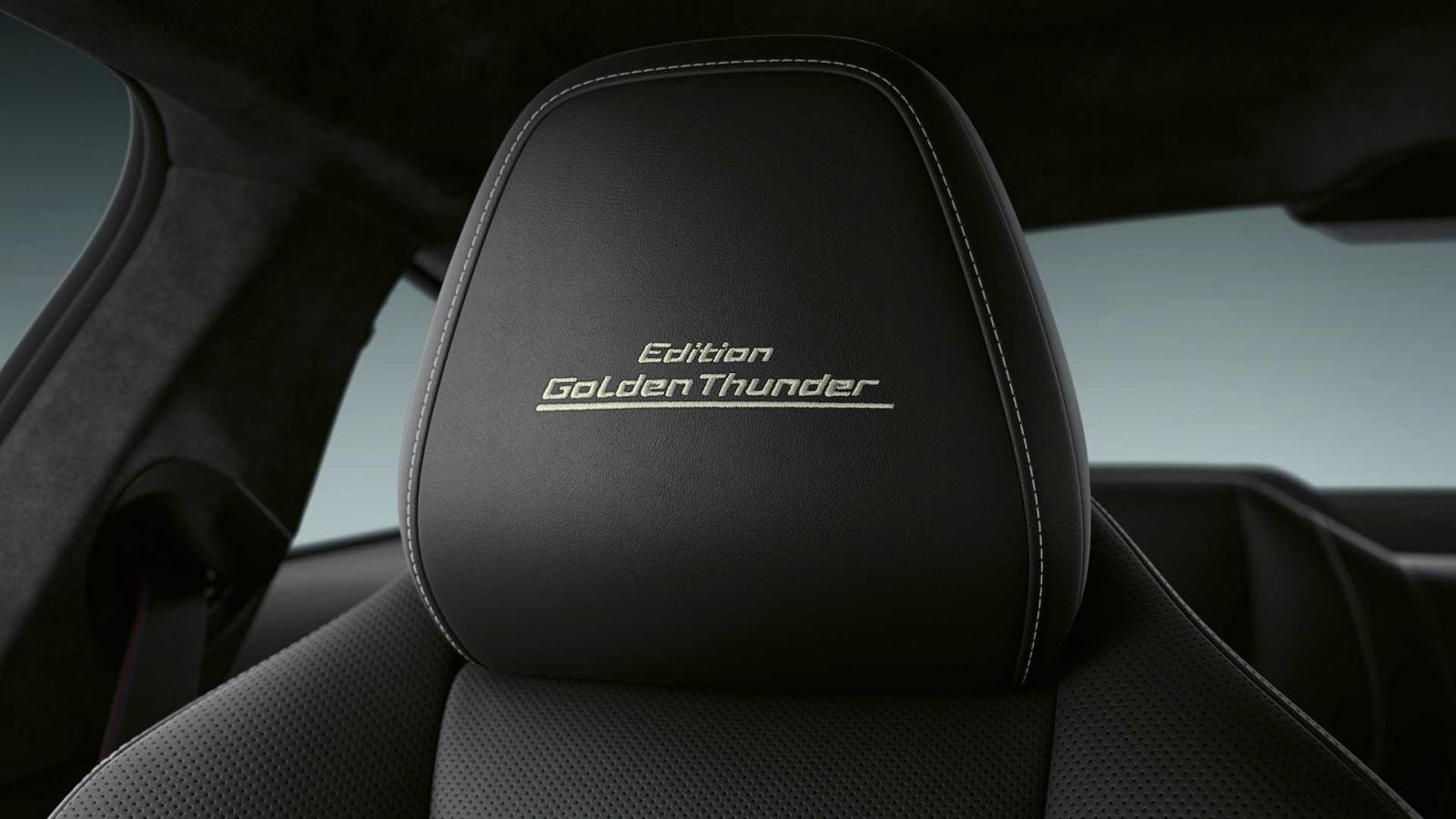Tiến vào trong, mẫu xe hơi mới BMW 8-Series Golden Thunder Edition trang bị nội thất bọc da Merino màu đen với dòng chữ “Edition Golden Thunder” trên tựa đầu. Phiên bản Coupe và Gran Coupe có trần xe da lộn Alcantara Anthracite cũng như các chi tiết trang trí nội thất lưới vàng ánh kim Aluminium Mesh Effect Gold.
