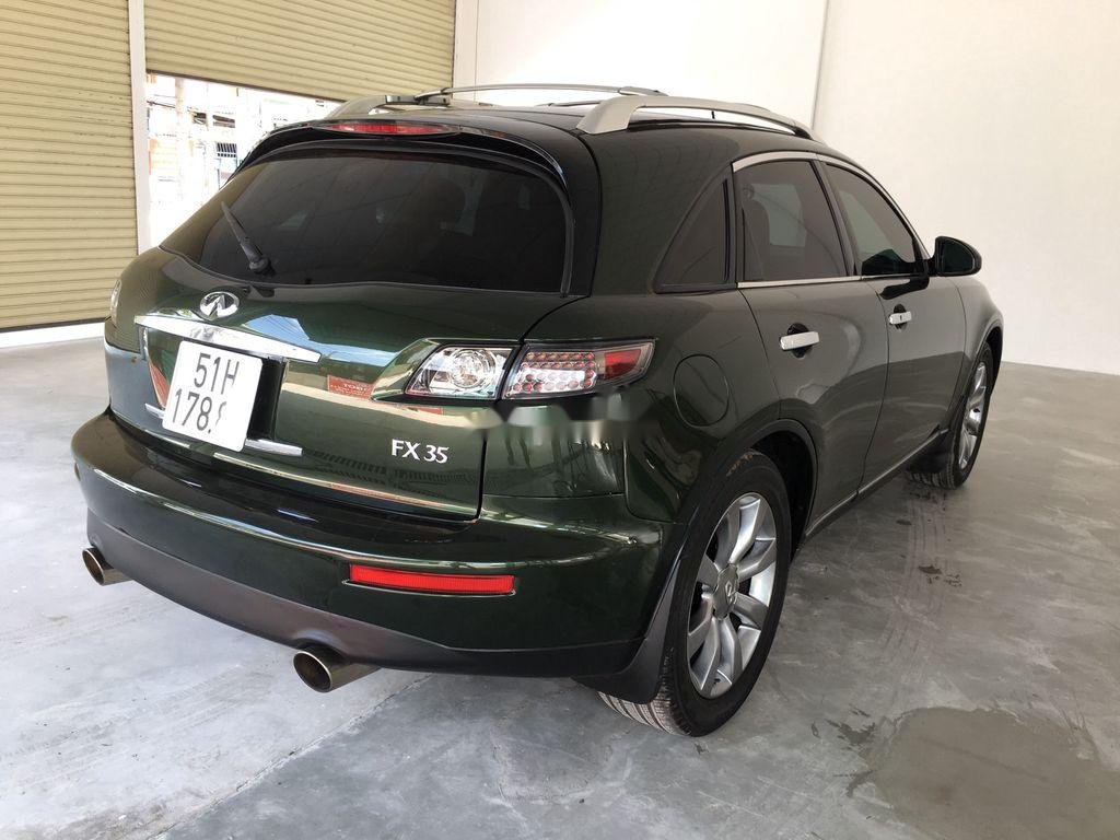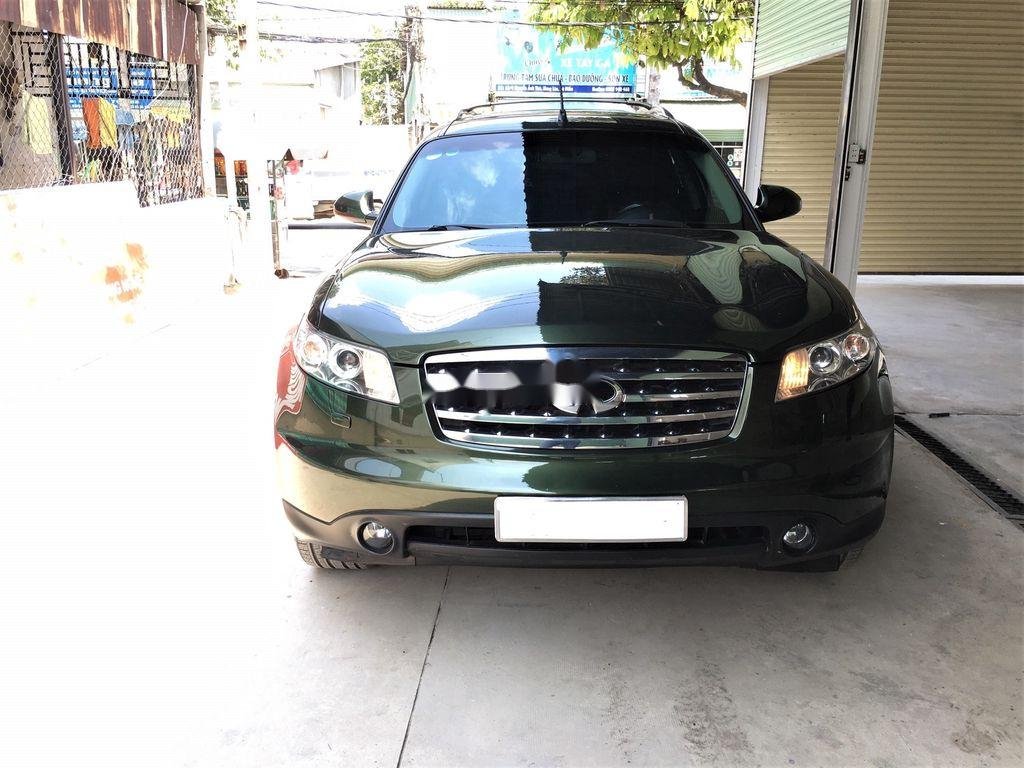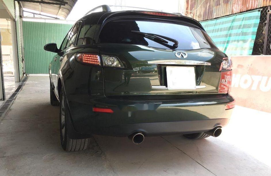 Infiniti FX35 đời 2005 được rao bán nhập khẩu nguyên chiếc, màu sơn ngoại thất xanh rêu Army cực kỳ hầm hố và cá tính. Phần đầu xe có lưới tản nhiệt dạng hình thang với các thanh nan sáng bóng kích thước lớn và logo thương hiệu nằm chính giữa, cụm đèn pha to và khá đơn điệu 2 bên, đèn sương mù tròn nằm ở vị trí khá thấp. Viền kính và tay nắm cửa có cùng tông màu sáng tương phản màu thân xe. Cản va sau thiết kế đơn giản với ống xả đơn. Đèn báo phanh trên cao tích hợp cùng cánh gió đuôi xe. Mâm 8 chấu đơn khỏe khoắn.