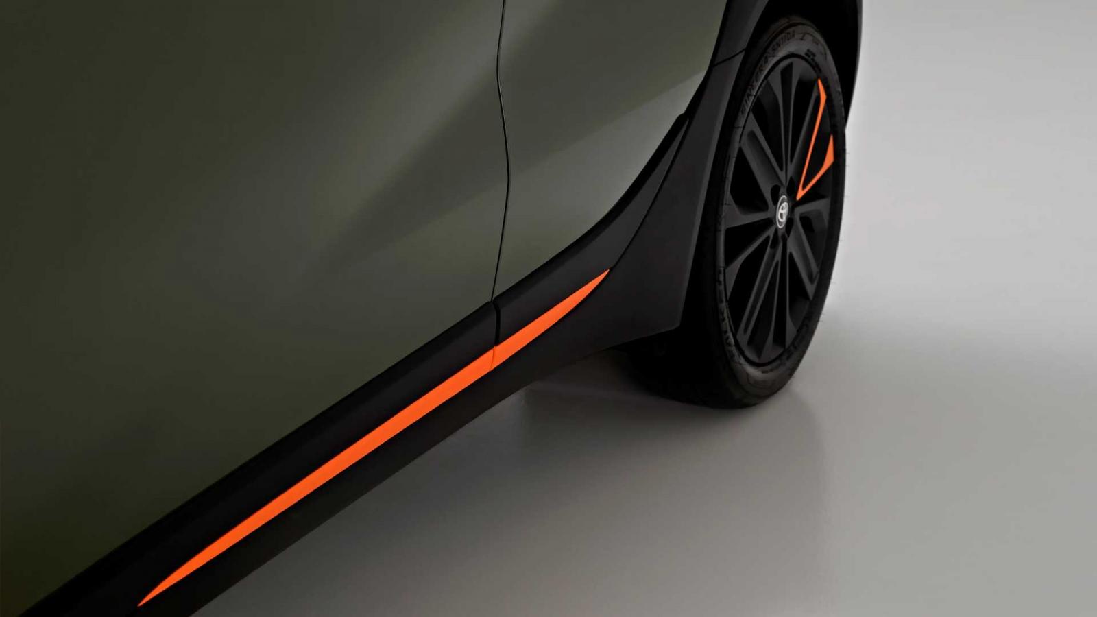 Để làm nổi bật phong cách Crossover, Toyota Aygo X 2022 có sử dụng các tấm ốp nhựa lớn màu đen trên vòm bánh xe kết hợp với màu sơn 2 tông màu. Bên cạnh đó, khoảng sáng gầm cũng tăng thêm 11 mm so với người tiền nhiệm.