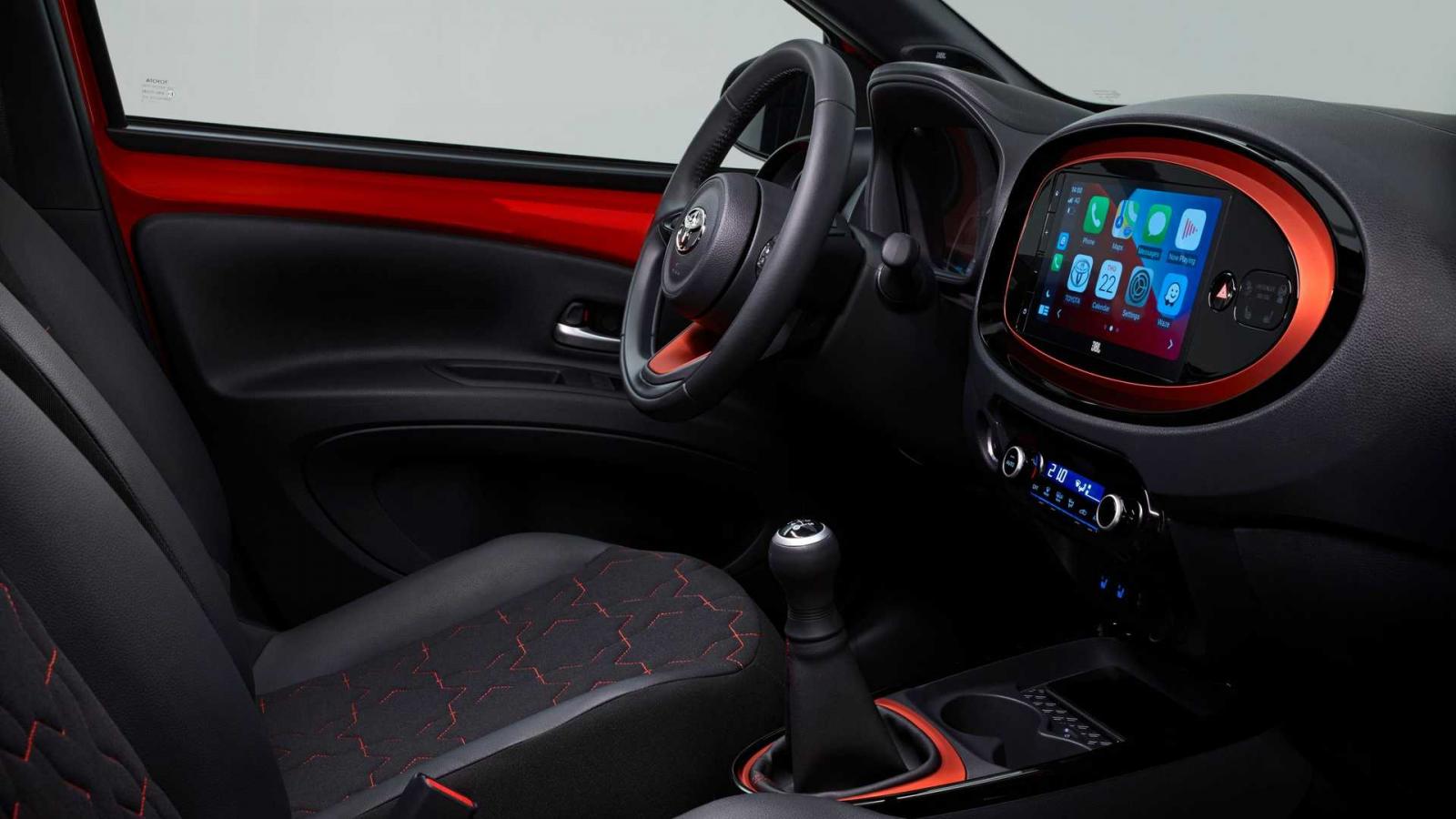 Giống như ngoại thất, cabin của Toyota Aygo X 2022 cũng cuốn hút khi có các điểm nhấn màu sắc sặc sỡ và bảng điều khiển lạ mắt với màn hình cảm ứng 9 inch. Mặc dù được định vị là xe giá rẻ tại châu Âu, Toyota Aygo X vẫn được trang bị hệ thống đèn viền nội thất và sạc không dây.