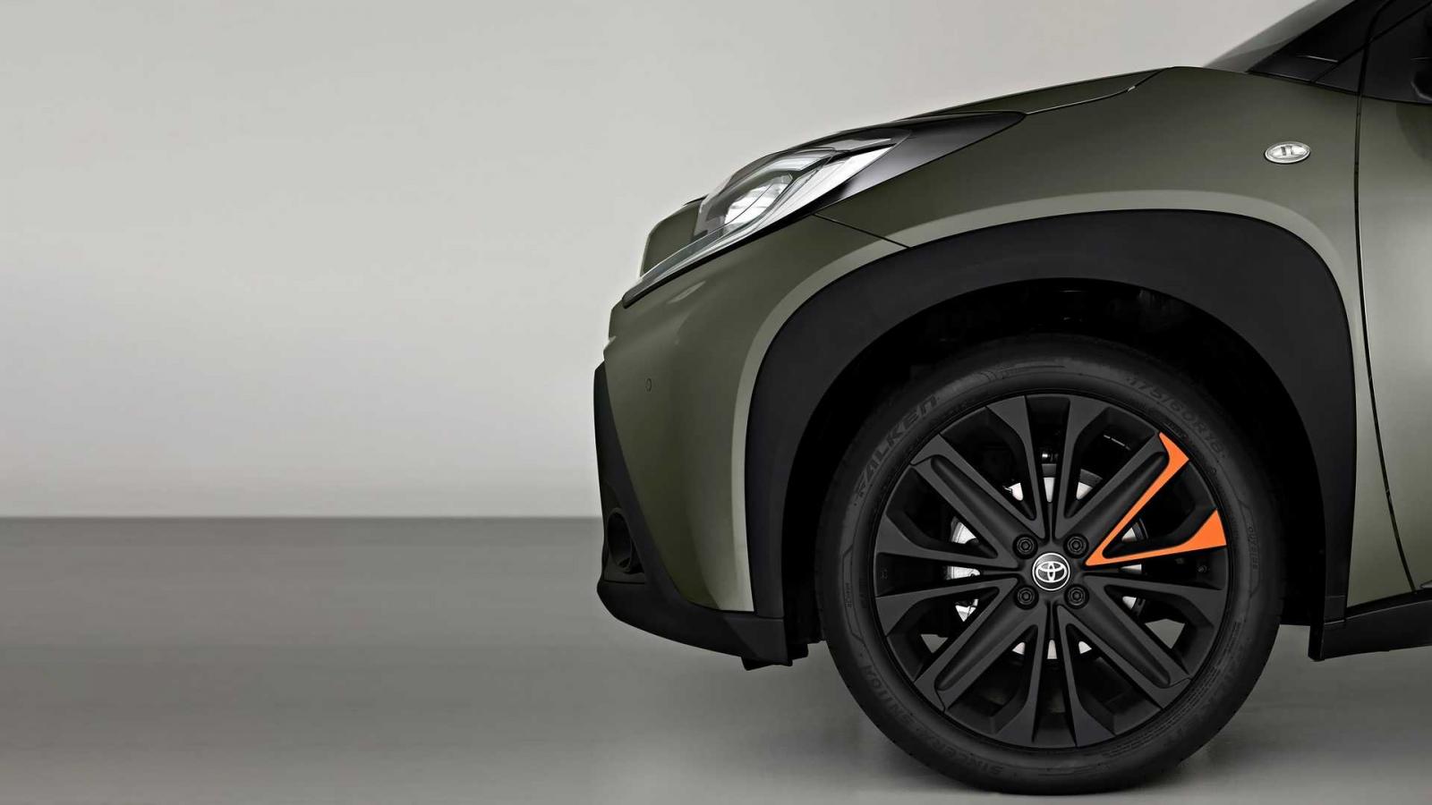La-zăng lên tới 18 inch là điều hiếm gặp ở một chiếc xe đô thị như Toyota Aygo X. Nó có 2 tuỳ chọn, phay bóng hoặc bằng màu đen mờ với các điểm nhấn màu cam (Mandarina). Xe dựa trên nền tảng GA-B và tiếp tục cung cấp mui vải có thể thu gọn. Đáng chú ý, với bán kính quay xe chỉ 4,7 m, Aygo X là mẫu xe lý tưởng cho khu vực đô thị đông đúc với những con phố chật hẹp.